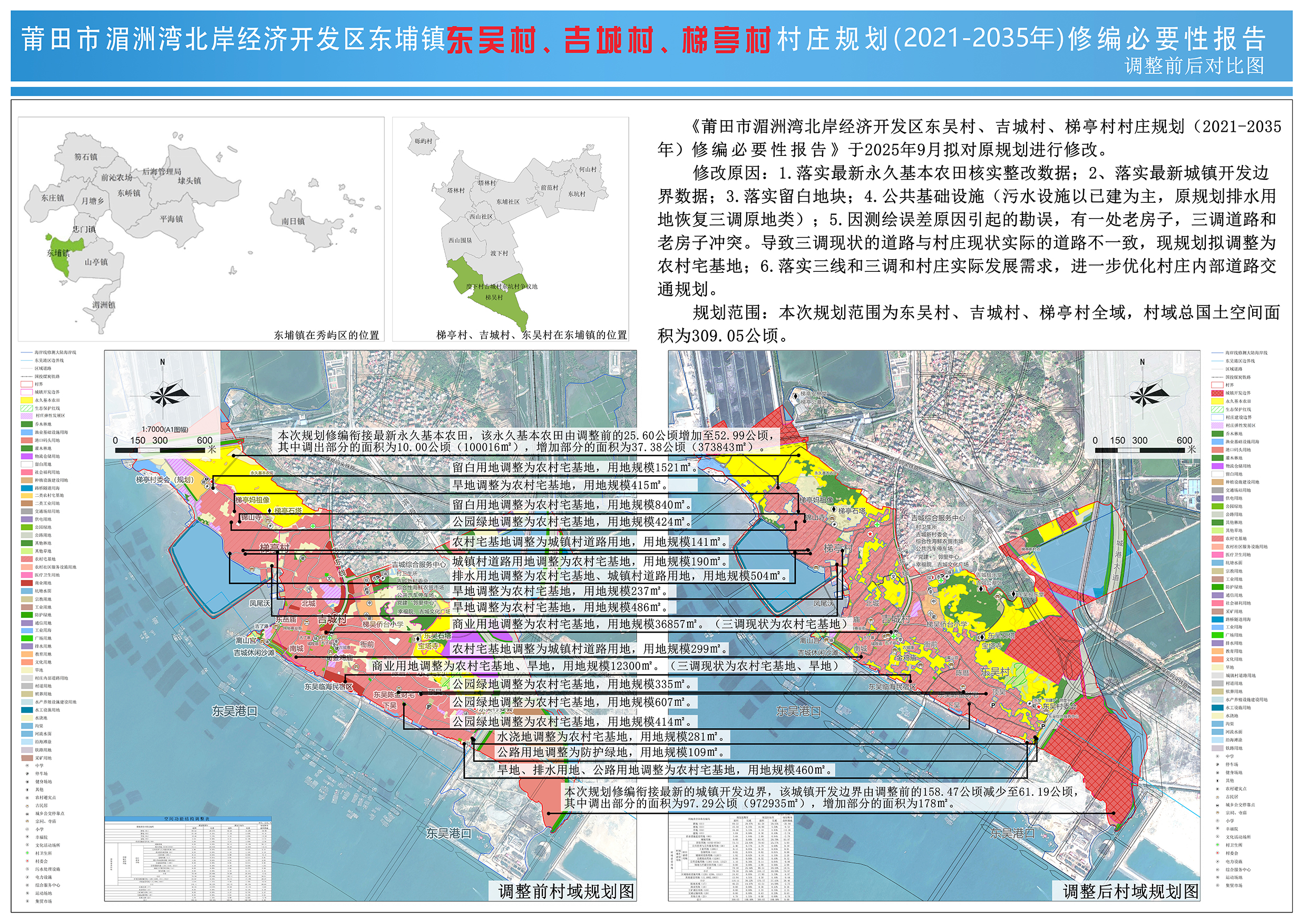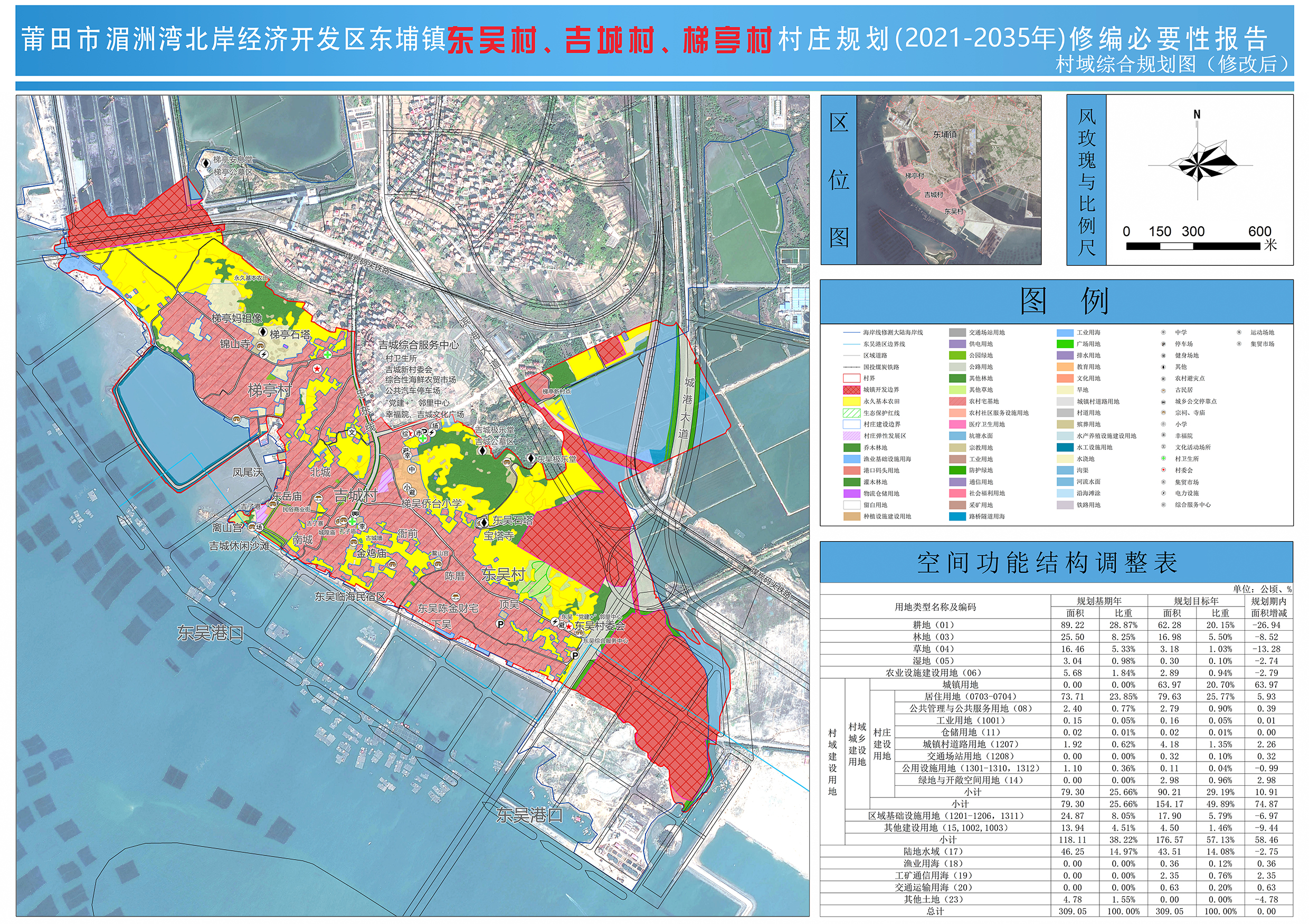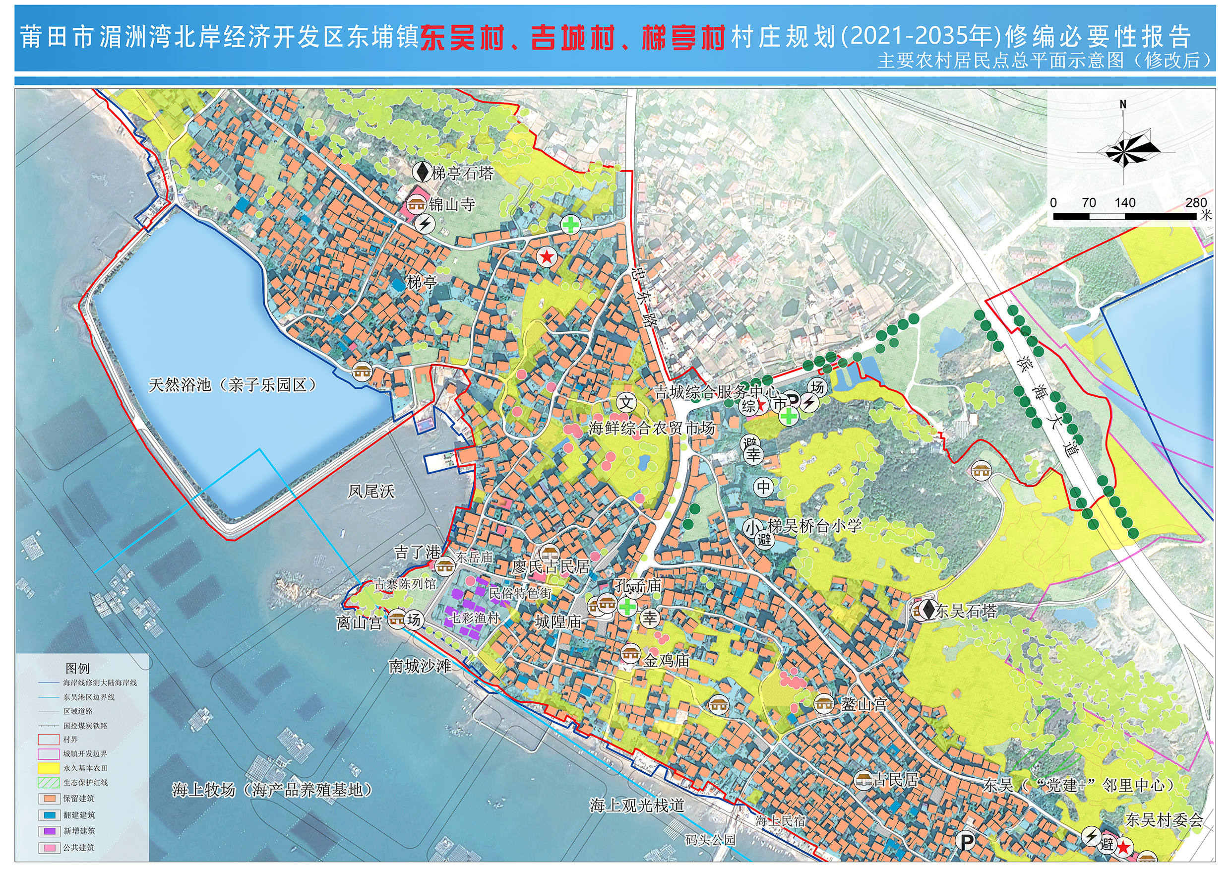 东吴村、吉城村、梯亭村位于东埔镇西南部,东吴村下辖顶吴、下吴、陈厝3个自然村;吉城村下辖衙前、南城、北城、吉蓼4个自然村;梯亭村下辖梯亭1个自然村。规划四至范围:西南北三侧与湄洲湾相邻,东侧与度下村相邻。规划总用地面积约309.05公顷。《莆田市湄洲湾北岸经济开发区东埔镇东吴村、吉城村、梯亭村村庄规划(2021-2035年)》于2021年12月10日经湄洲湾北岸经济开发区管委会批复(莆湄北管[2021]69号)。为落实最新永久基本农田核实整改数据、最新城镇开发边界数据、留白用地及充分征求与核实村民建房需求,进一步优化村庄用地布局,拟对原村庄规划进行修编。